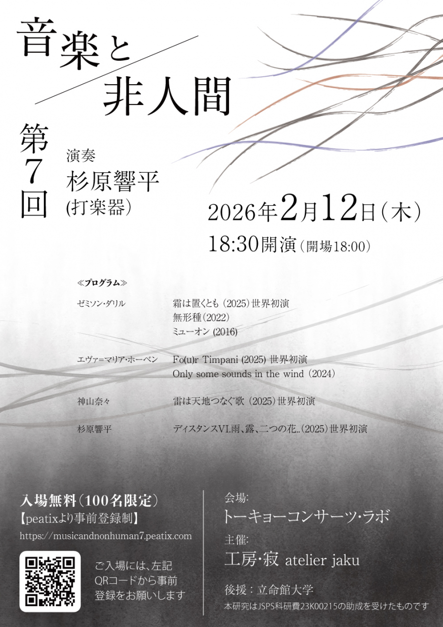 今年度の「音楽と非人間」というコンサートシリーズは、3年間の研究プロジェクトの一環で、前近代的で非西洋的な存在論に根差した日本の哲学と美学を基にして、人間の音と非人間の音の関係を新たな視点から解釈します。